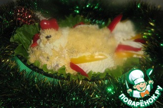 Приближается Новый 2017 год. Значит, пришло время для тематических салатов. Рецепт и оформление -моё авторство. А еще, я пишу стихотворения и пока творила салат, сложились следующие строчки — рецепт в стихах;-))